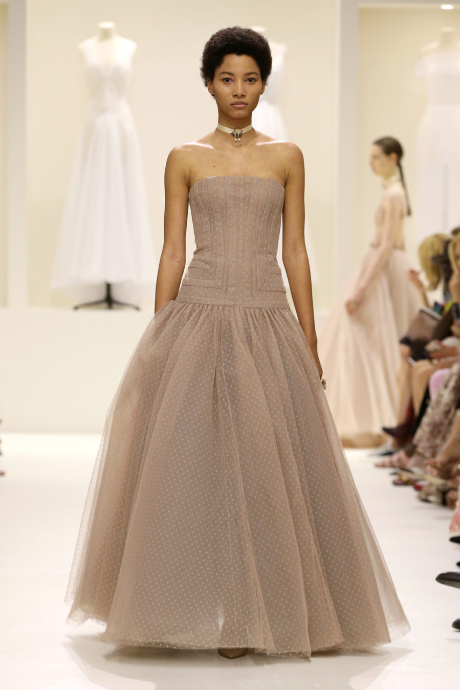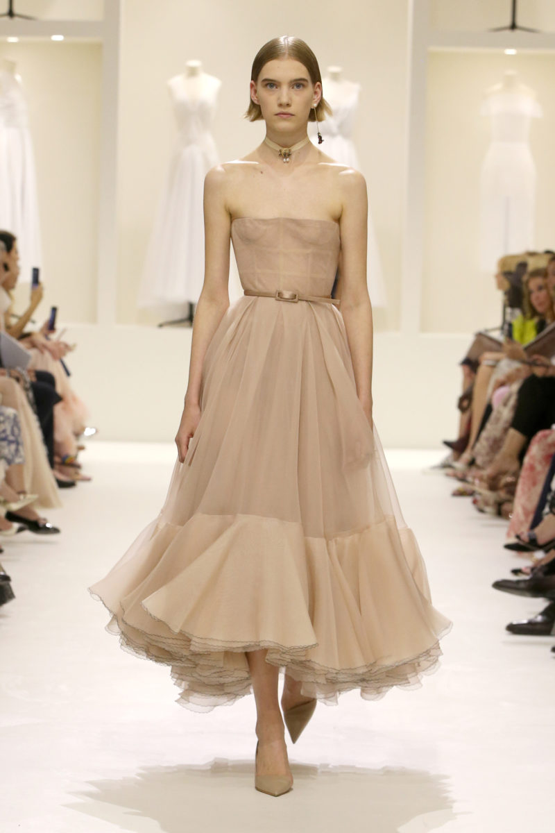 From a palette of blush, rose, navy and primarily nude, Chiuri’s pieces were an idealistic perception of what couture is and will carry on being for the generations to come. I don’t say that based on the collection of toiles that decorated the venue, which mind you seemed a bit revenant – but because of the endearing body-con portrayal of couture garments.