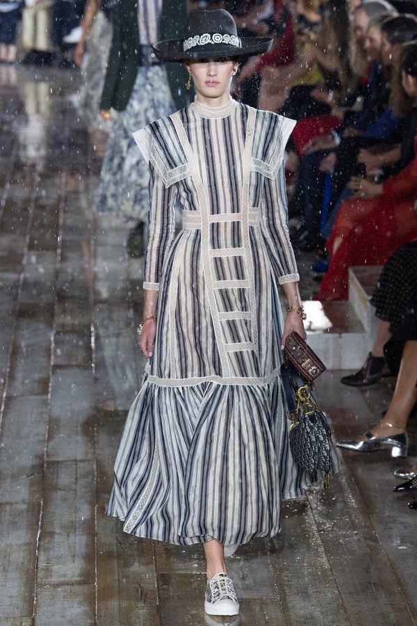 Taking the aesthetic further, flared printed cotton skirts were paired with intricately embroidered high neck blouses and featured a custom made print of Chiuri’s compelling new take on Toile de Jouy featuring lions, monkeys and serpents. As a creative would do, there were varied versions of the saddlebag, considered as the current “It” bag ever since its debut during the Fall show that took place in February.