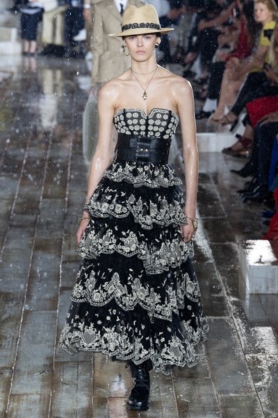 Picking up on the inspiration and the historical references of Devin Doyle photographs, her ensembles involved lace, lace and more lace, which was arranged, and sewn over one another in the most beautiful, and intricate way possible. Juxtaposing that were tailored two-piece suits, and well fitted trousers, matched accordingly with riding and Wellington boots, that came in the shades of black, brown, and palm green. Chiuri’s aim was to mix the feminine with the oh-so-macho – and that she did. Adding onto that was the layer upon layer of petticoats that came in tulle, printed chiffon, and patchwork, which was adorned with more lace.