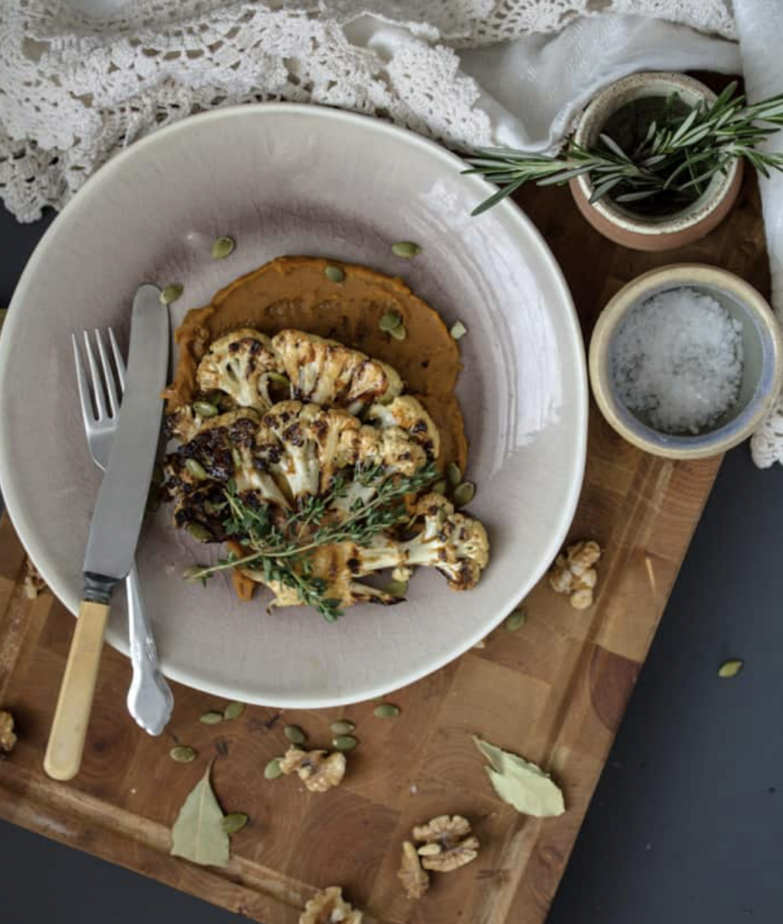 Roasted Cauliflower Steaks On Spicy Sweet Potato Puree