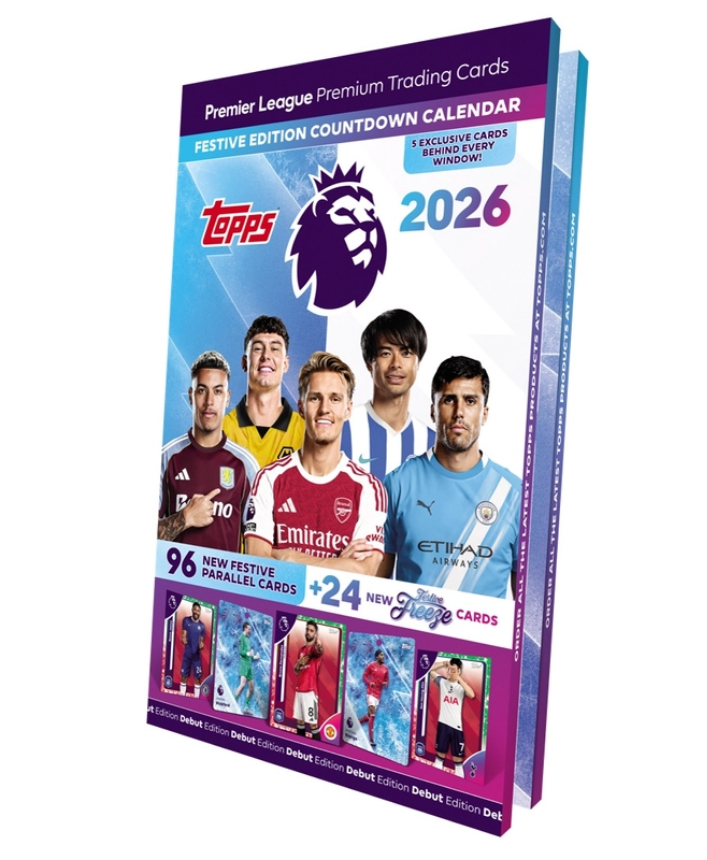 The Topps Premier League Trading Card Game: 2026 Festive Edition Countdown Calendar contains 24 exclusive Festive Countdown packets. Each calendar also has 4 exclusive Festive Parallel cards and 1 exclusive Festive Freeze card.