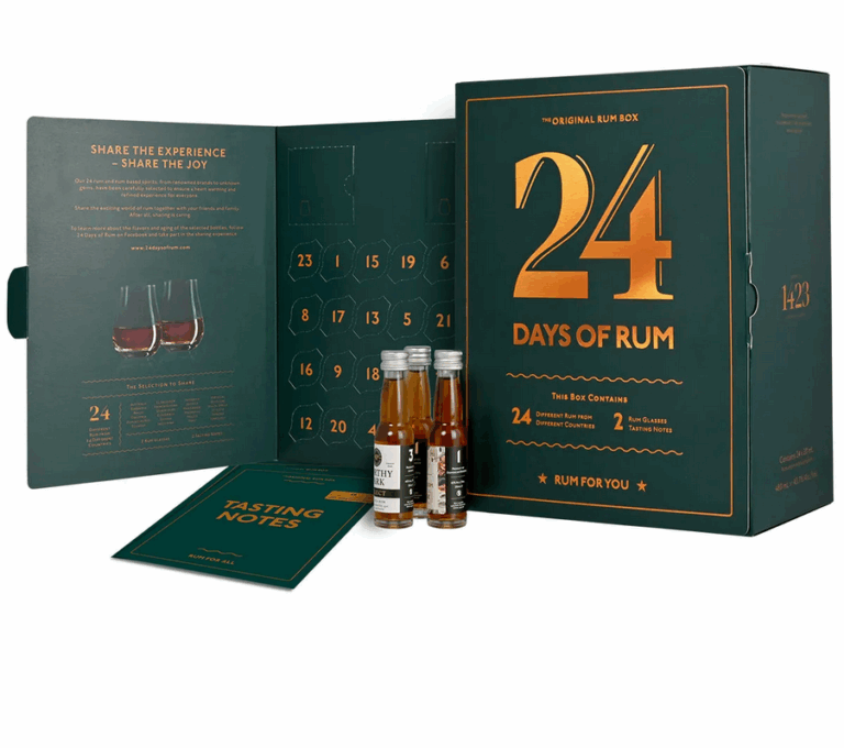 Embark on a voyage through the world of rum, one miniature at a time. Inside this limited-edition Rum Advent Green Edition lies a spirited adventure: 24 exquisite rums from 24 different countries, each revealing its own story of sugarcane, sun and still. From golden Caribbean treasures to dark, mysterious sippers of Latin America, every pour brings something new to discover. Handpicked from both renowned names and hidden gems, these tasting drams offer a journey through styles, origins, and production traditions – perfect for newcomers and rum devotees alike. The box also includes two tasting glasses, note folders, and access to the 24 Days of Rum community, where fellow enthusiasts share in the spirit of discovery. Simply unveil the rum of the day, raise a glass, and toast to the joy of good company.