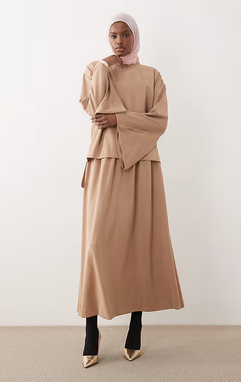 IYAL luxe wide sleeve top, abya and maxi skirt co-ord in camel £60