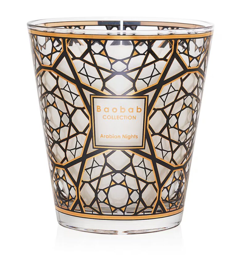 The ultimate luxury gift for candle lovers. Inspired by the unwavering strength of sunlight, this perfume extract from Baobab presents the Arabian Nights candle, which upon lighting will envelop your home in a scent experience of the Middle East. The smoky notes, featuring oud, saffron and incense will invite you to a captivating land of a thousand and one nights, as the screen-printed glass holder features nine-karat gold that is reminiscent of the mashrabiya found in Arabian architecture.